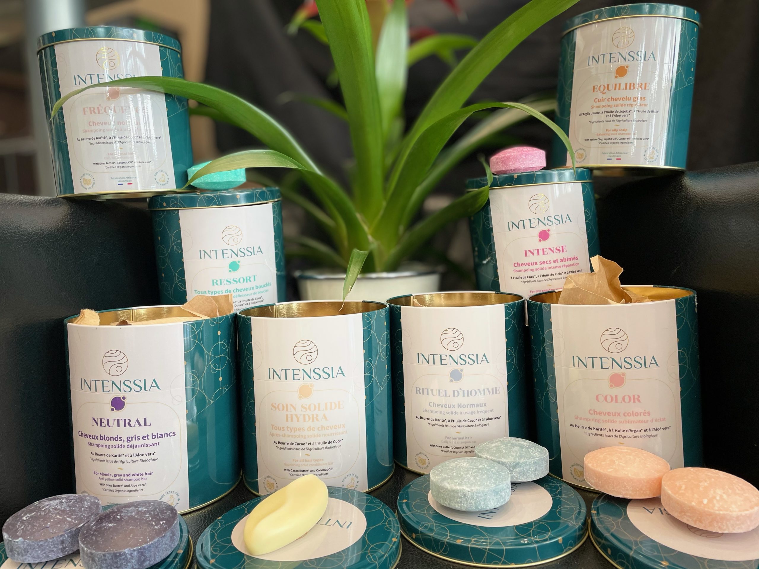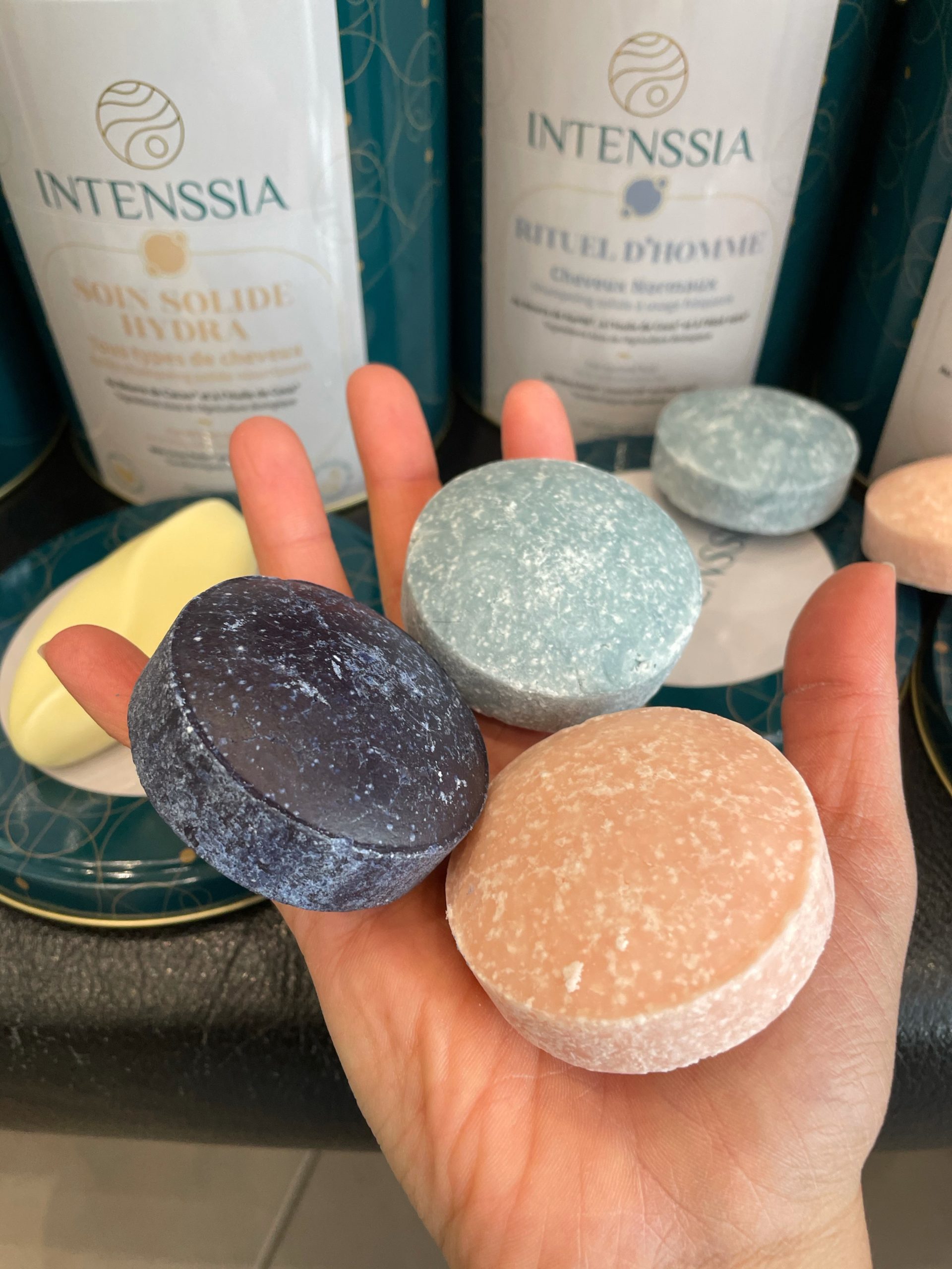 Vous les avez peut-être déjà remarqués si vous êtes venu-e-s au salon récemment, des petits nouveaux ont fait leur apparition dans notre vitrine et derrière nos bacs : les shampoings et soins solides Intenssia.